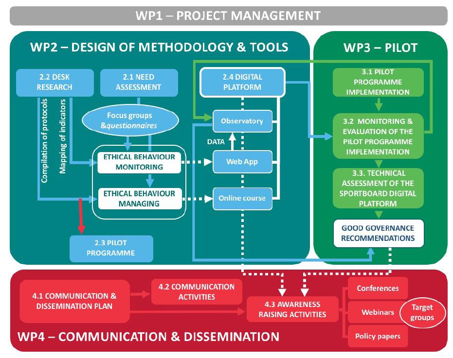 A set of preparatory activities (WP2) will be organised during the first fourteen months of the project. This preparatory work and knowledge will lead to design of the core Deliverables: SportBoard Pilot Programme and Digital Platform. The Pilot Programme will be implemented within WP3. Crosscutting WP1 and WP4 will provide efficient project management procedures and dissemination activities. Intercorrelation between the WPs are presented in the Pert Chart.
