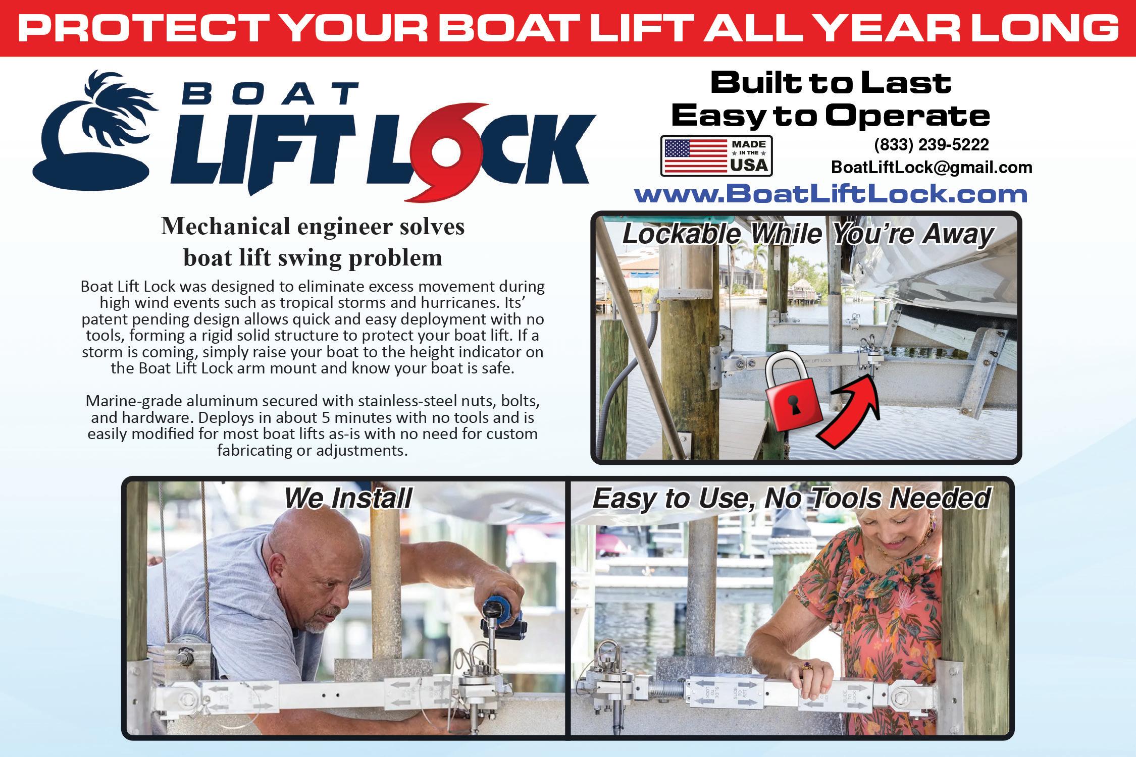 What you won’t find on the Coast Guard checklist, or in most articles written about preparing your boat for a hurricane, is information about how to prepare your boat lift for a hurricane. With the Boat Lift Lock, it’s as easy as raising your boat on the lift and using the already installed adjustable arms to pin your boat lift in place. Even if you choose to remove your boat to offsite storage, you’ll want to secure your lift. That will help prevent damage to it or to your pilings from wind-driven movement.