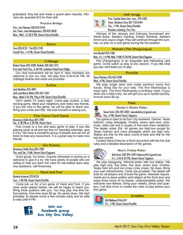 Euchre Jack Matthies 825-4891 Jack and Maria Welch 520-395-1205 Mon., Meet 5:45 PM, Play 6 PM, Desert Oasis/Ocotillo Don’t watch TV every night. Come play euchre, a fastmoving game. Meet your neighbors and make new friends. If you are new to the game, we will be glad to teach you. Bring your smile and 50¢. We look forward to seeing you.