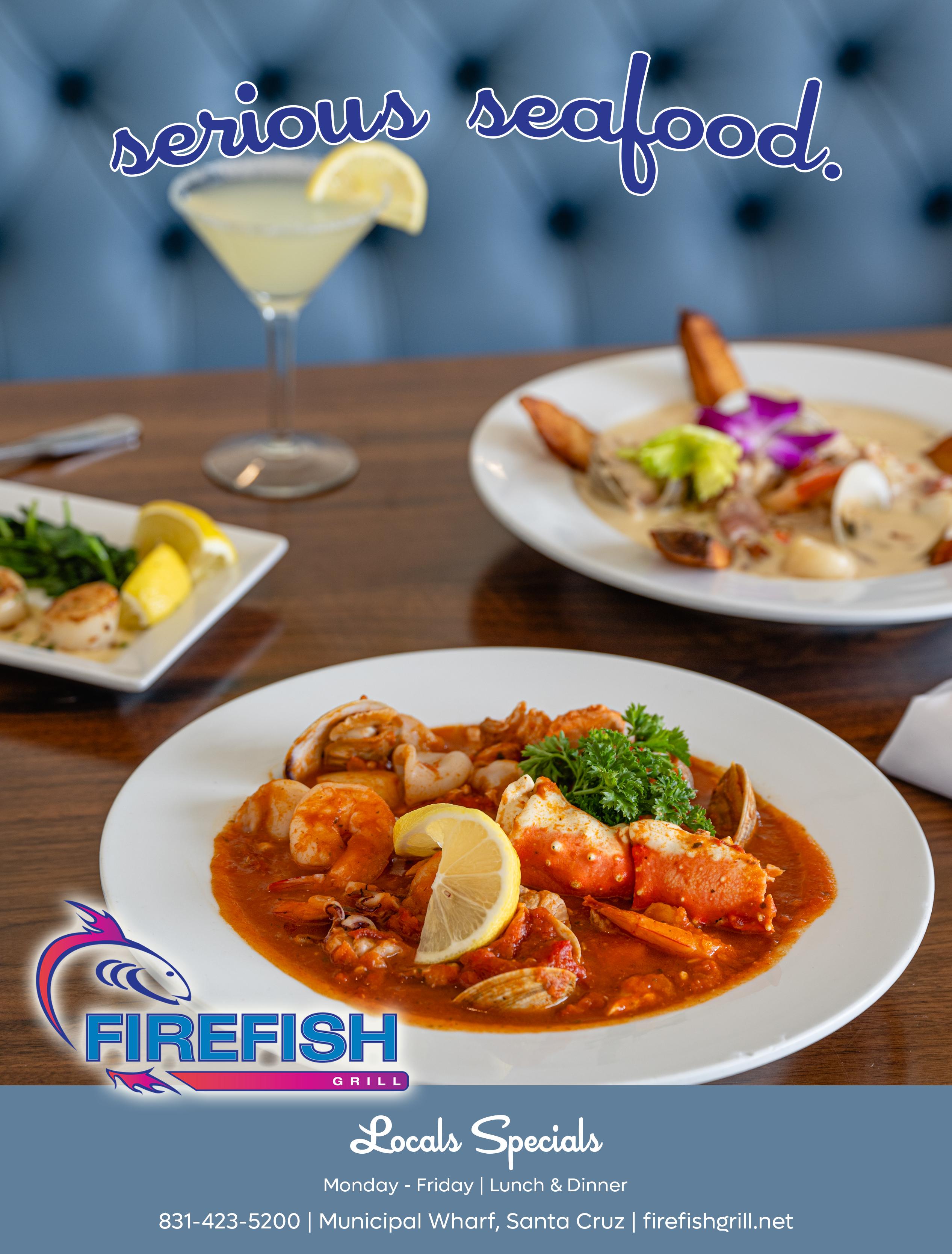 SANTA CRUZ VIBES| 85 ! ! ! 2621 41st Ave, Soquel | (831) 476-3801 | CafeCruz.com Nightly Specials • Sustainable Seafood Full Bar • • Fresh, Local & Organic Produce • Natural Source-Verified Meats HEATED PATIO • CURBSIDE PICK UP Banquet room