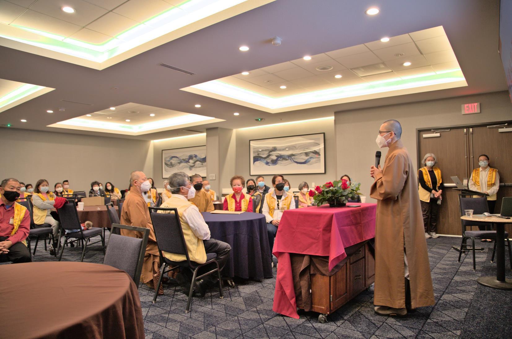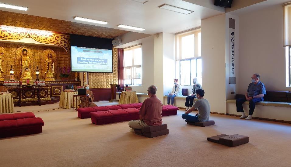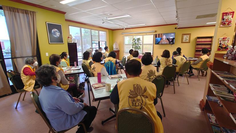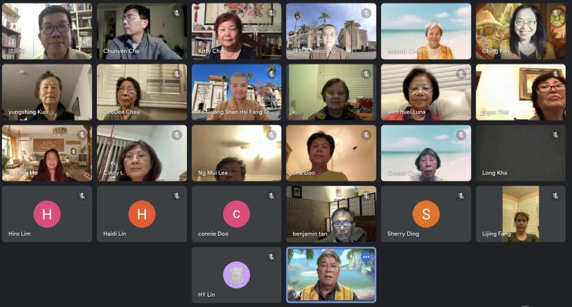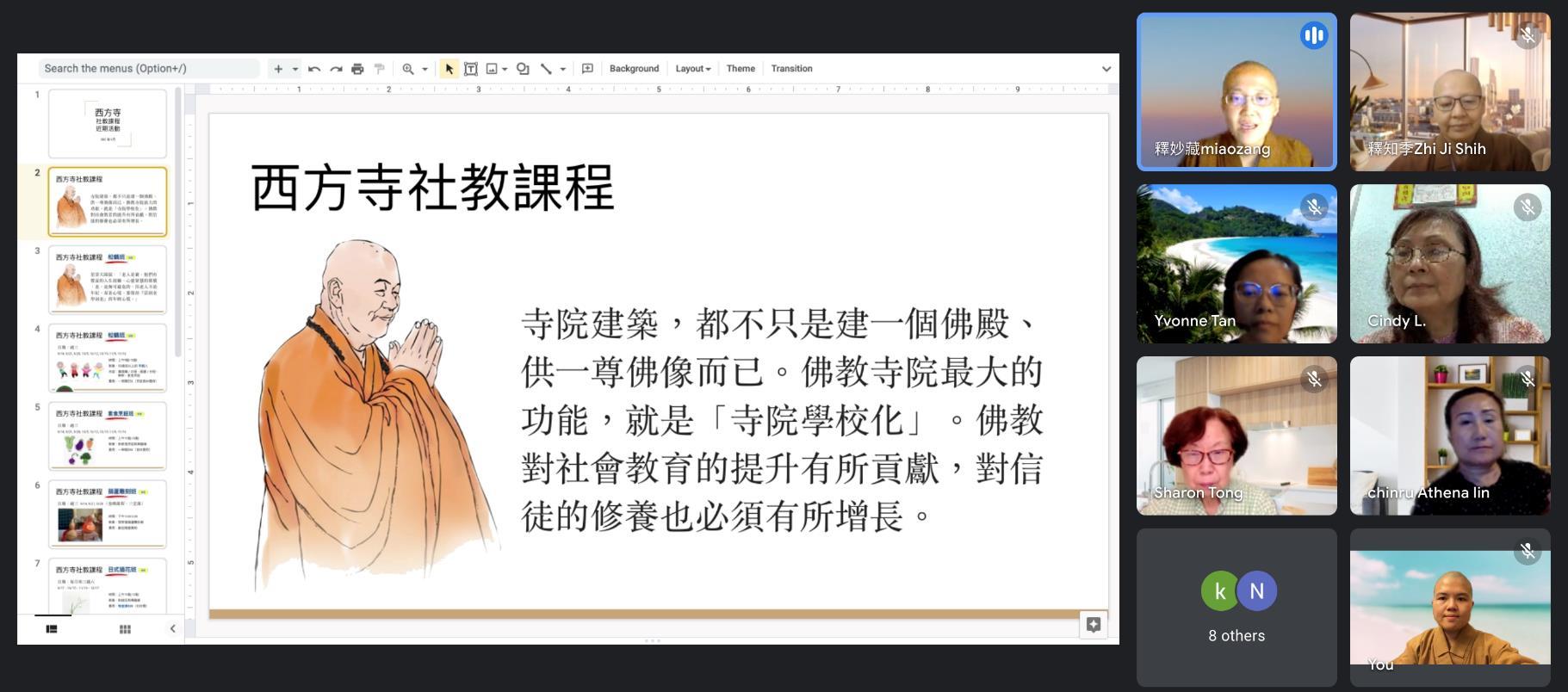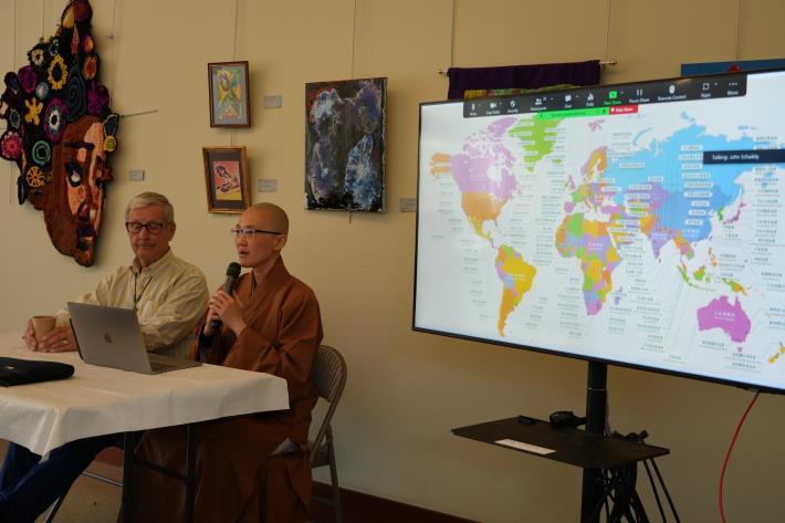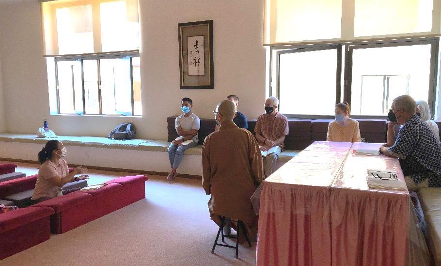 英文佛學課程由監寺妙藏法師教授,採取實體及雲端同步模式, 讓住在聖地牙哥的美籍人士有因緣回到法身慧命之家,也讓其他地 區學員連線參加。