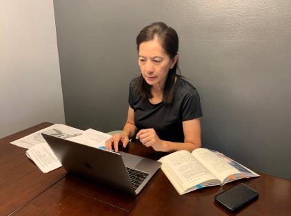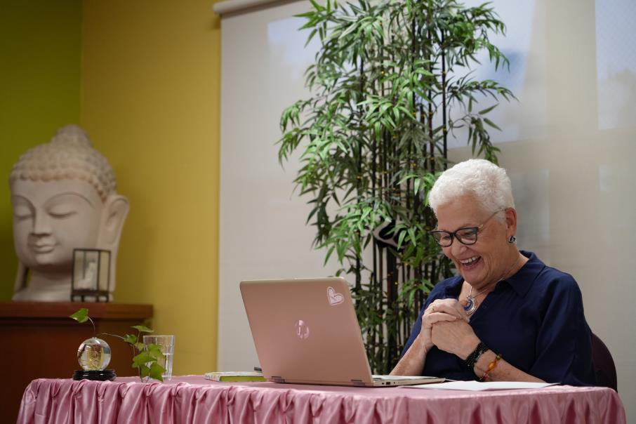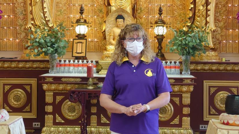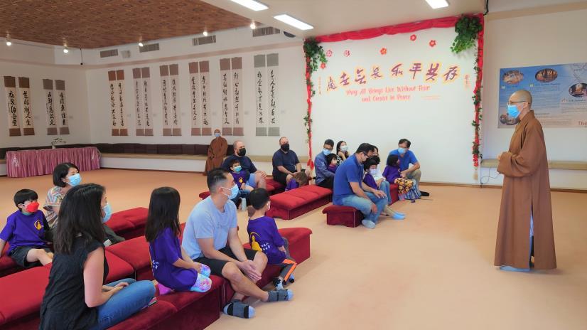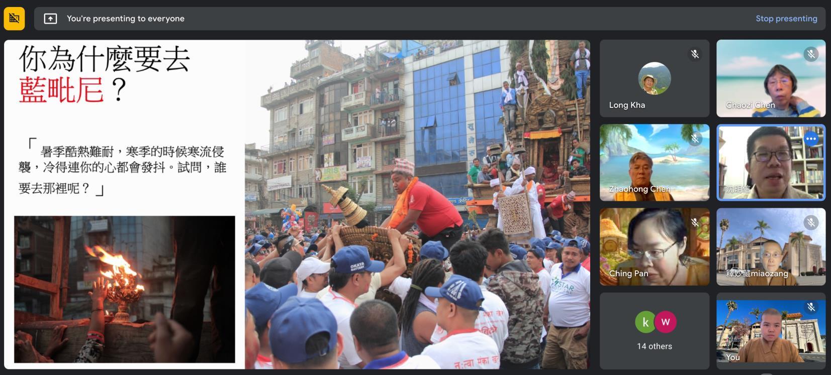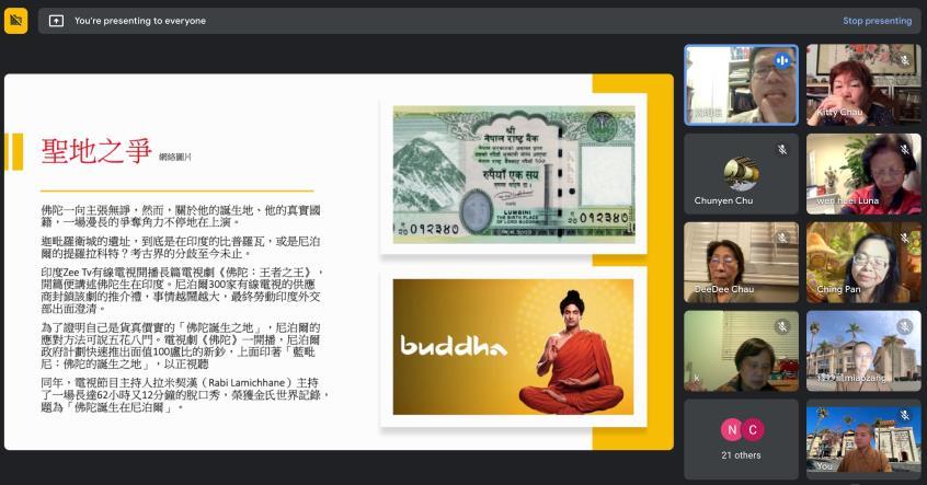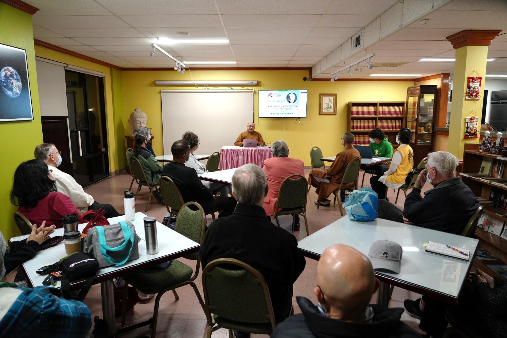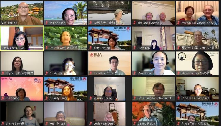 英文佛學課程由監寺妙藏法師教授,採取實體及雲端同步模式, 讓住在聖地牙哥的美籍人士有因緣回到法身慧命之家,也讓其他地 區學員連線參加。