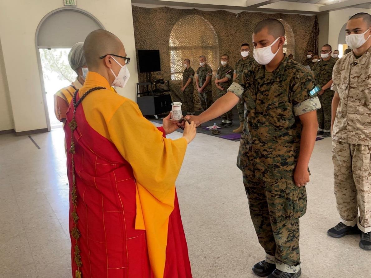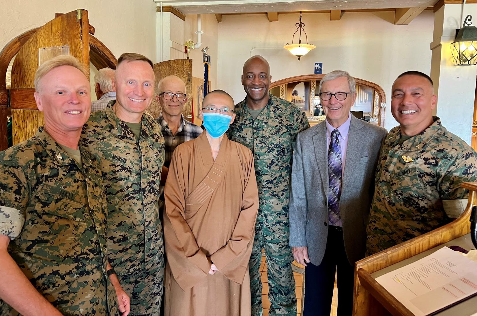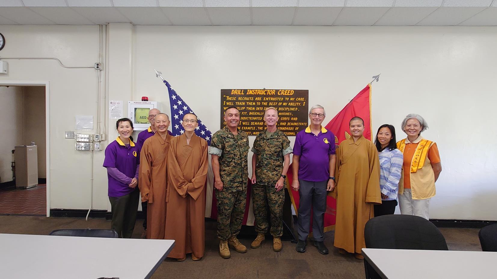 在海軍陸戰隊培訓基地帶領週日共修的各宗教人士 (上圖),屬於義工計劃其中一部分。西方寺受邀參加於於2023年4 月25日舉辦的義工表揚會(Volunteers Recognition Ceremony)到營地 出席簡便午餐聚會,全場約200位義工出席(下圖)。海軍陸戰隊義 工計劃有現役人員、他們的家庭成員、退休人員、退伍軍人和一般大 眾;他們為軍營及社區提供服務,建設菜圃、房屋油漆、教育活動、 心靈輔導等。