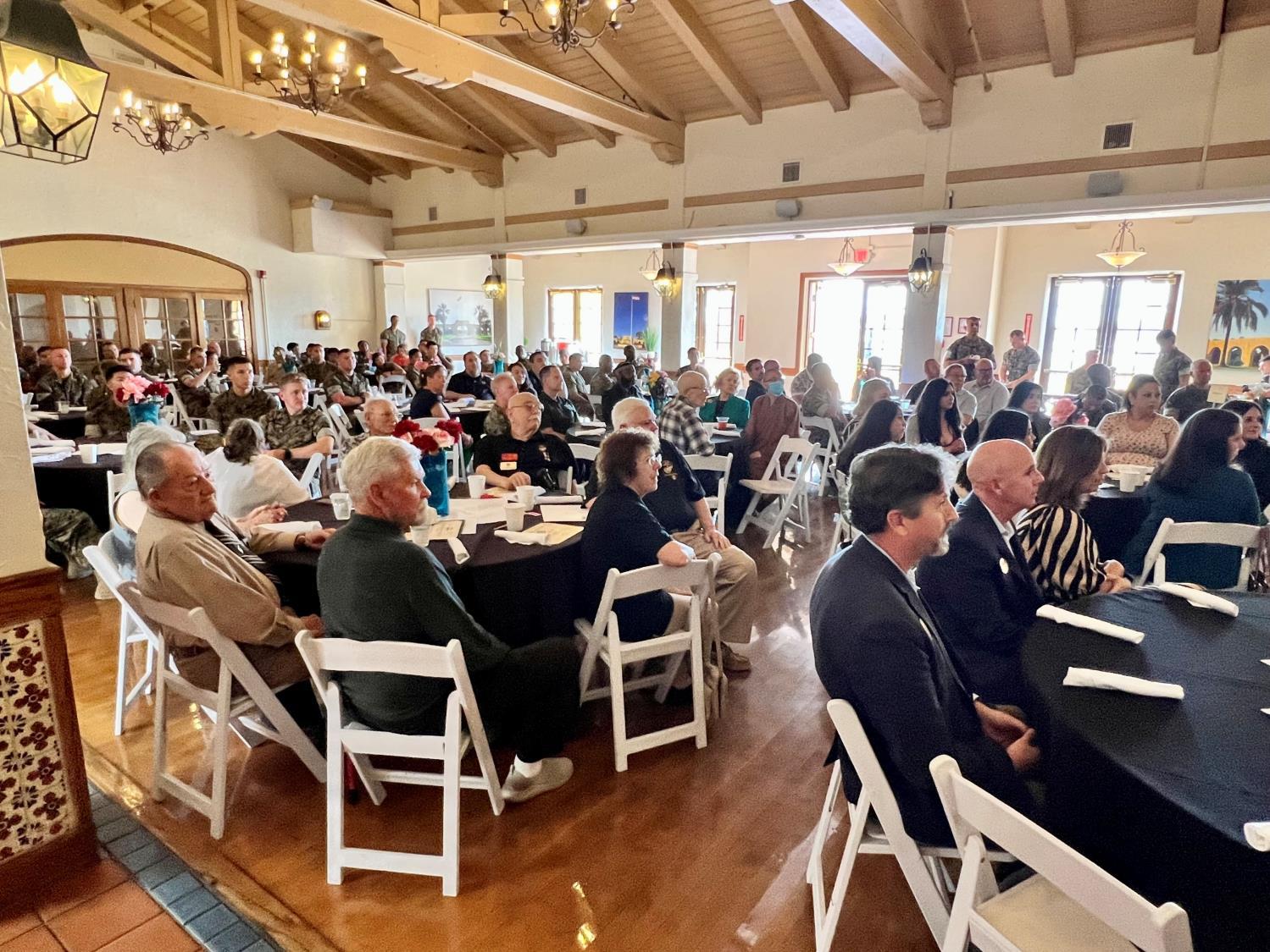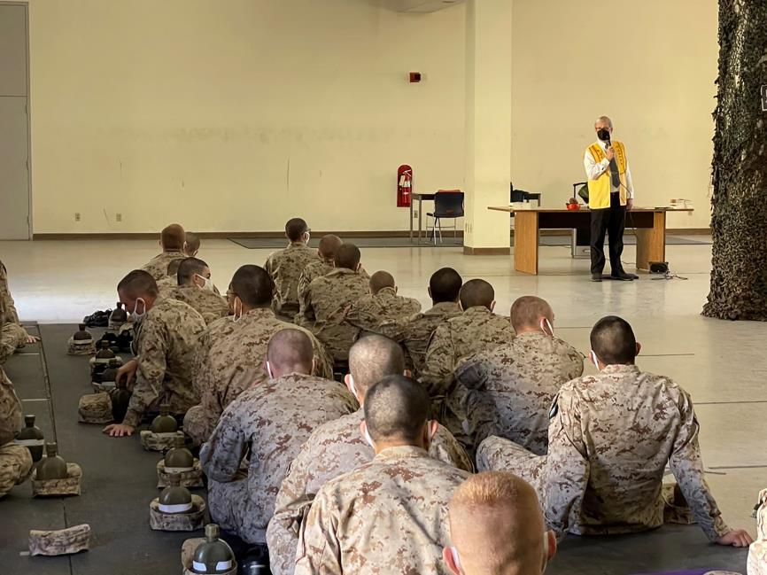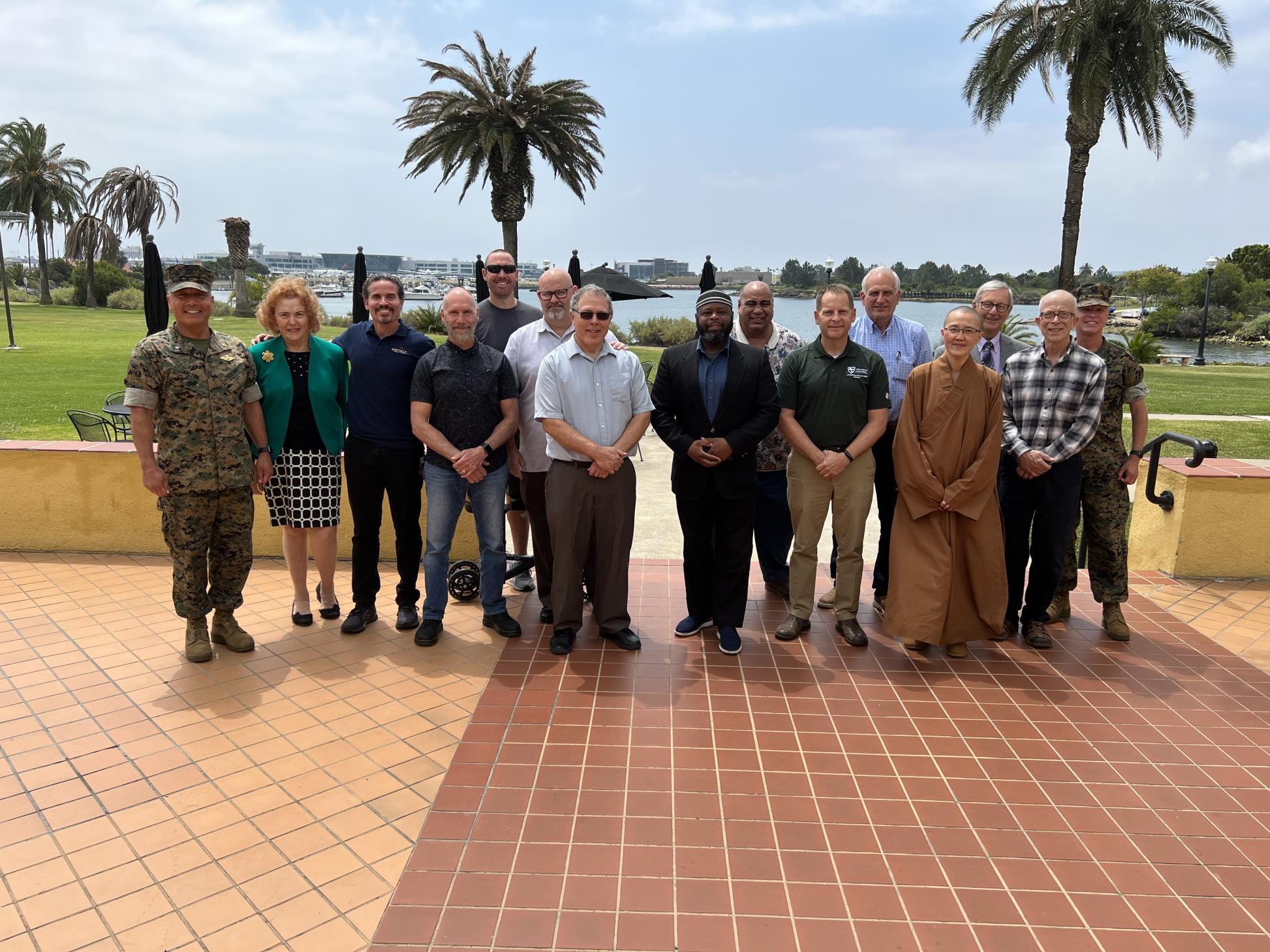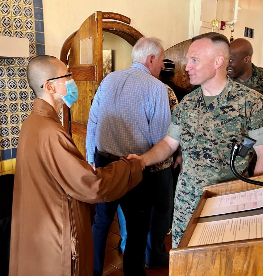 在海軍陸戰隊培訓基地帶領週日共修的各宗教人士 (上圖),屬於義工計劃其中一部分。西方寺受邀參加於於2023年4 月25日舉辦的義工表揚會(Volunteers Recognition Ceremony)到營地 出席簡便午餐聚會,全場約200位義工出席(下圖)。海軍陸戰隊義 工計劃有現役人員、他們的家庭成員、退休人員、退伍軍人和一般大 眾;他們為軍營及社區提供服務,建設菜圃、房屋油漆、教育活動、 心靈輔導等。