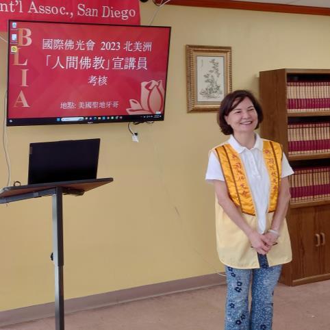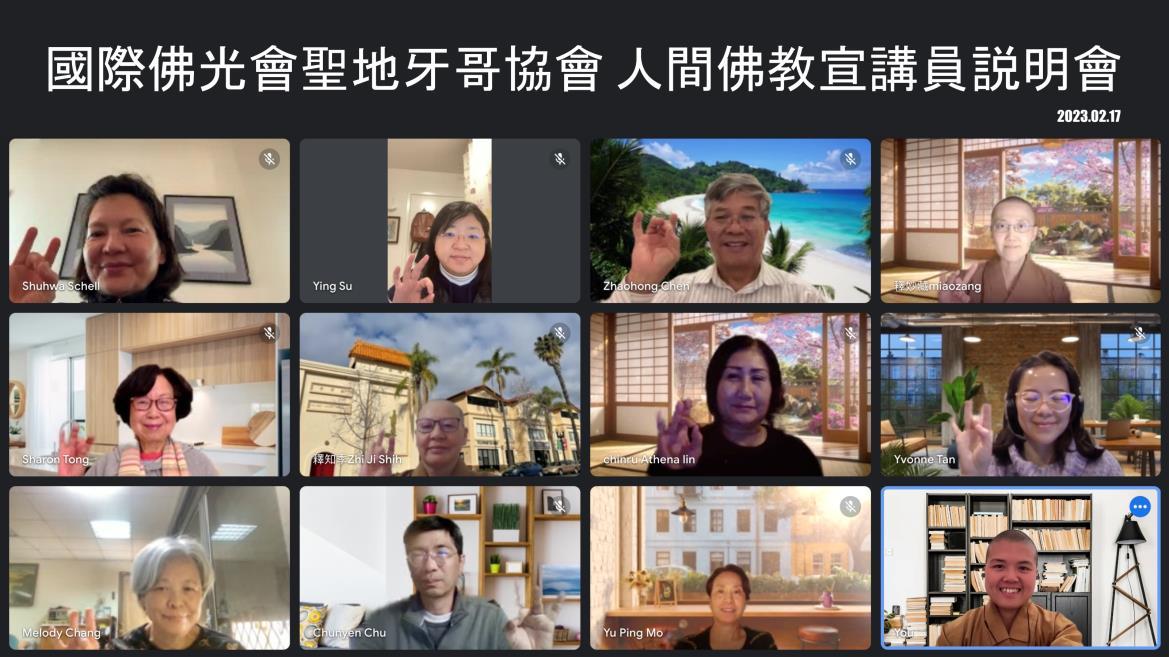宣講員說明會聖地牙哥協會於2023年2月17日召開 人間佛教宣講員考核說明會,西方寺監寺妙藏法師、協 會會長陳兆洪等12人出席線上會議。法師勉勵,宣講員 肩負弘揚人間佛教使命,以言語傳播真善美。