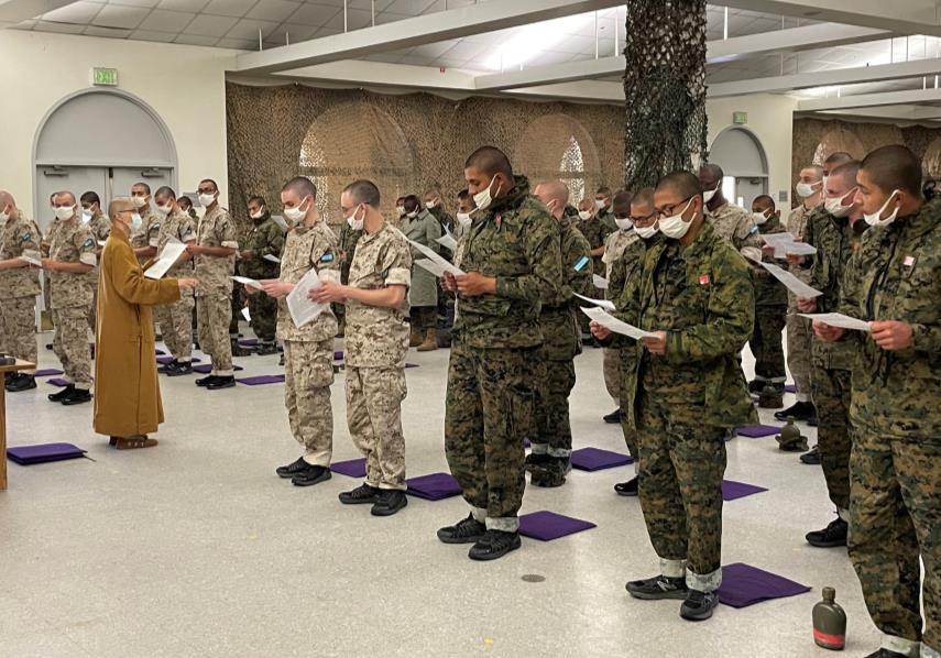 日共修前,各宗教代表都必須參與培訓 基地舉辦的講習會,且每年都需再參加 一次。講習會內容包含基地內行動範圍、 與募兵的互動規範、軍中用詞等一一詳 細說明,並會立即針對上課內容給予考 試。西方寺於2021年4月15日,首次參 與講習會(右圖)。