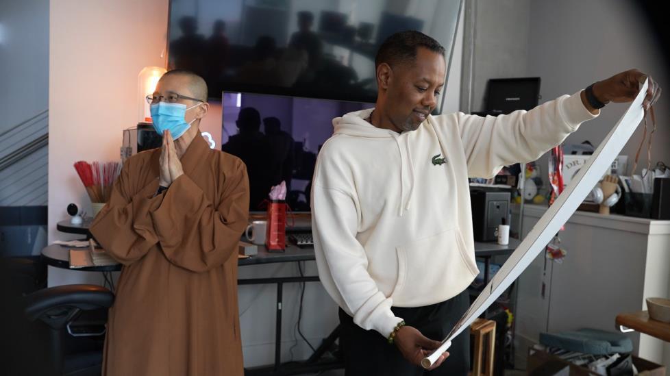 凡事親力親為的老闆Aaron表示,影片製作產業日新月異,面對障礙最實際 的是「找方法解決」而非坐以待斃;超越並非偶然,必經過千生萬死才能 成功,安逸無法進步。監寺妙藏法師贈予星雲大師一筆字捲軸「佛」。