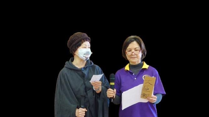 結業成果展,學員表演人間音緣 《給》結合樂活排舞(上圖),以 及話劇「老人是寶」(下圖)。