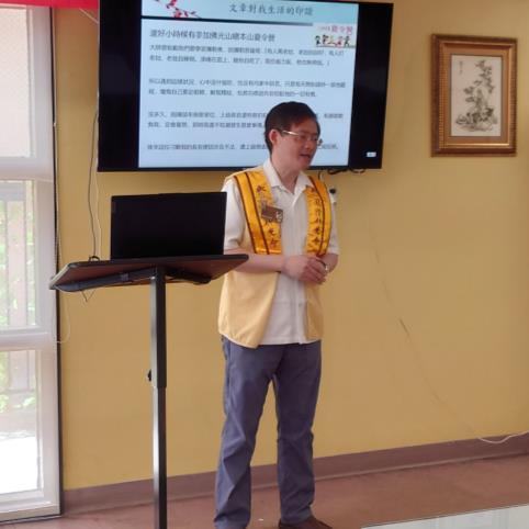 現場講說佛光會務的重要性及會務內容。習會結束前,覺仲法師頒贈人間佛教宣 講員勳章給佛光幹部劉淑華、張徐慧媚、邱秀莉等三人,授證成為正式宣講員, 認證其通過4月份「2023年北美洲人間佛教宣講員」的培訓與考核。
