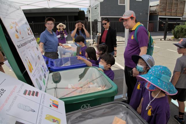 地牙哥市政廳環保專員 Noelle 和 Julianne 以各類材質,進行垃圾分類 小遊戲,講解新推行的綠色垃圾計畫, 希望透過推廣,民眾對於垃圾分類及 綠色垃圾計畫,有所了解及落實。