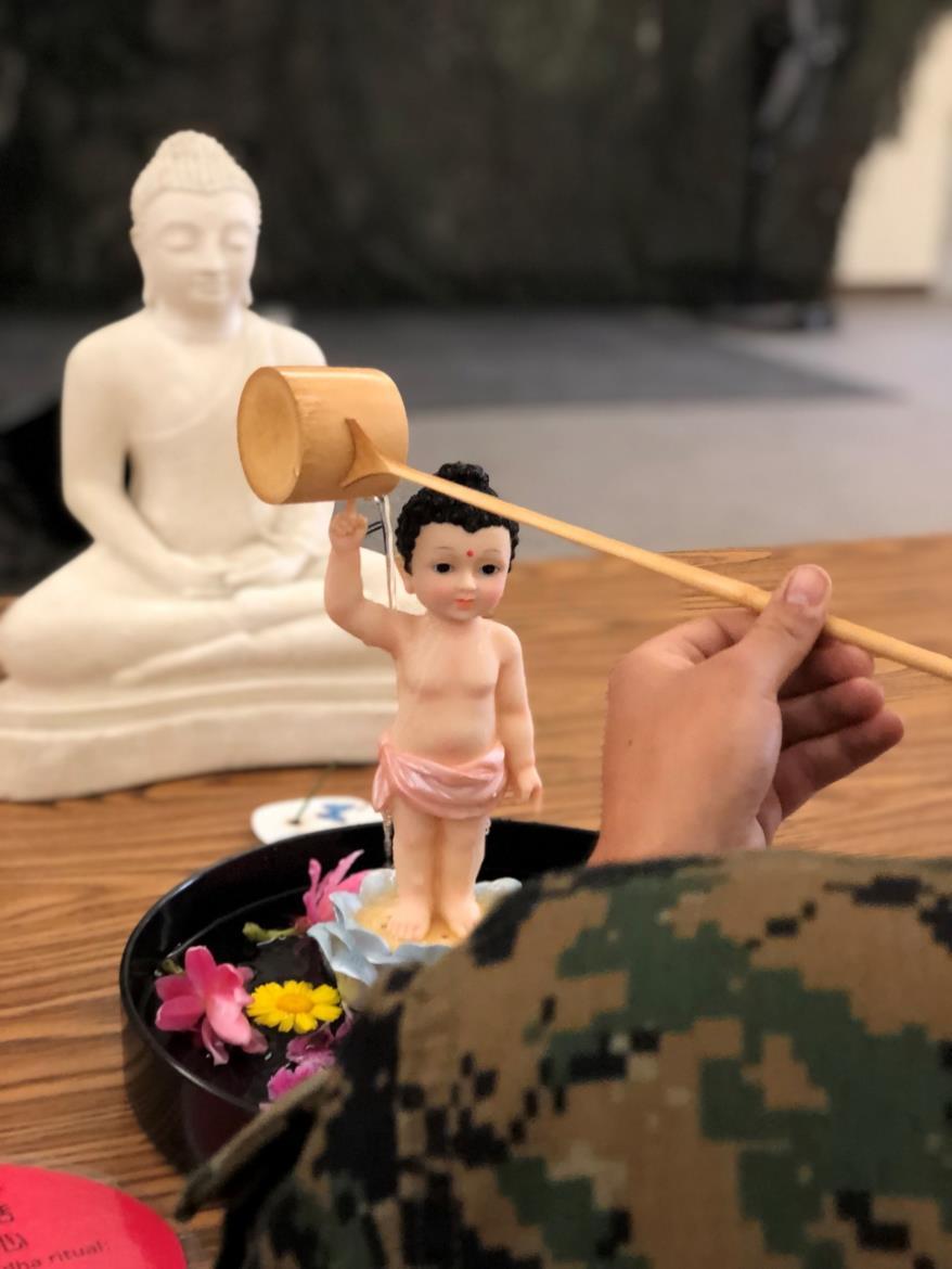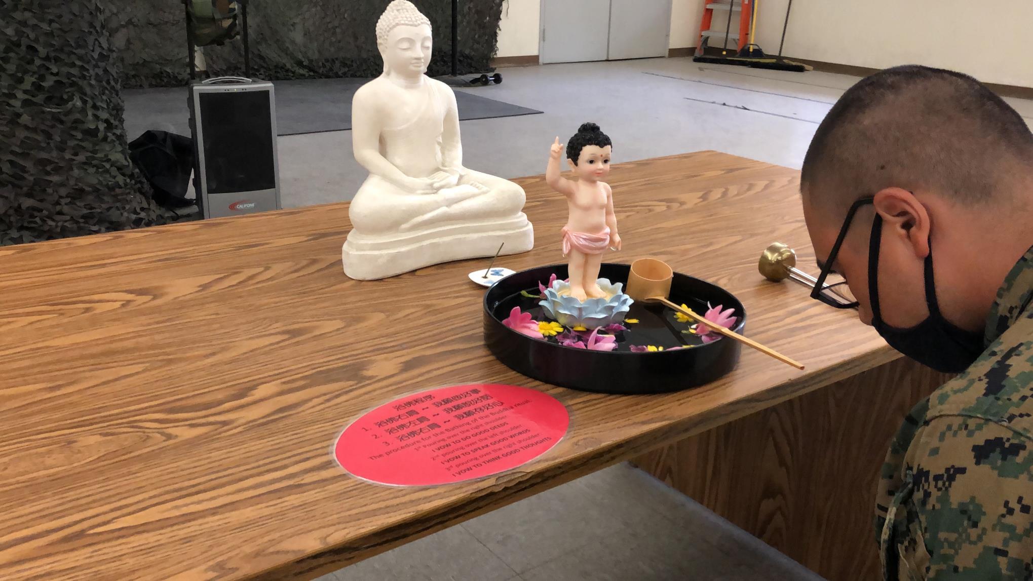 佛誕浴佛恭逢佛誕節將近,為 讓募兵了解教主釋迦牟尼佛,以 及有機會浴佛,妙藏法師於2023 年5月14日攜帶雲水浴佛池到培 訓基地,在周日共修中講述佛陀 一生,再引導募兵們一邊浴佛、 一邊發願。在場的募兵,大部分 都是初次體驗浴佛。