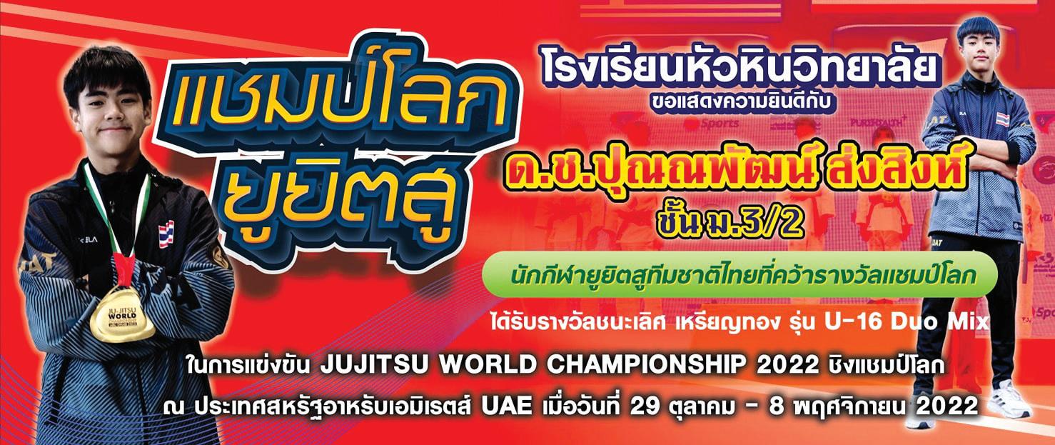 ด.ช. ปุณณ พ่ัฒ น ส่ง สิงห์์ ชีั�น ม.3 โรงเร่ ยนหัั วัหัิน วั ที่ ยา ลัย จิ .ประ จิวั บฯ เ ป็น ตุ วั แ ที่ น นัก ก่ ฬา ย ย ตุส่ ที่่ ม ชี า ตุิไ ที่ ย เข้้าแข้่ง ข้ัน JUJITSU WORLD CHAMPIONSHIP 2022 โด้ยได้้ รับรางวััล ชีนะเลศั เหัร่ยญที่อง รุ่น U-16 Duo Mix ณ กรุงอาบด้าบ่ ประเที่ศั ส่หัรัฐอาหัรับเอมิเรตุส่ เม่�อวัันที่่� 1 พฤศัจิิกายน 2022 Punnaphat