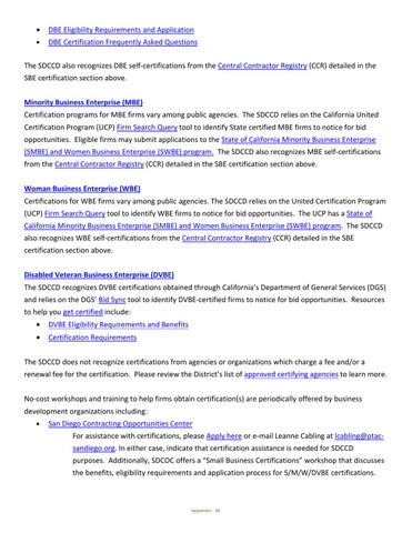 San Diego Contracting Opportunities Center For assistance with certifications, please Apply here or e‐mail Leanne Cabling at lcabling@ptac‐ sandiego.org. In either case, indicate that certification assistance is needed for SDCCD purposes. Additionally, SDCOC offers a “Small Business Certifications” workshop that discusses the benefits, eligibility requirements and application process for S/M/W/DVBE certifications.