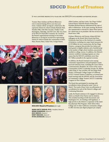 SDCCD Board of Trustees It was another productive year for the SDCCD’s five-member governing board. Trustees Mary Graham and Bernie Rhinerson were re-elected during 2016 to new four-year terms. Graham will be serving for a third term. She represents District D, which includes Rolando Park, Paradise Hills, Oak Park, Encanto, Chollas Creek, Kensington, Talmadge, and Del Cerro. She was sworn in by SDCCD Chancellor Constance M. Carroll at the Board’s organizational meeting in December. Rhinerson is serving his second term representing District B, which includes the communities of Mira Mesa, Kearny Mesa, Linda Vista, Scripps Ranch,