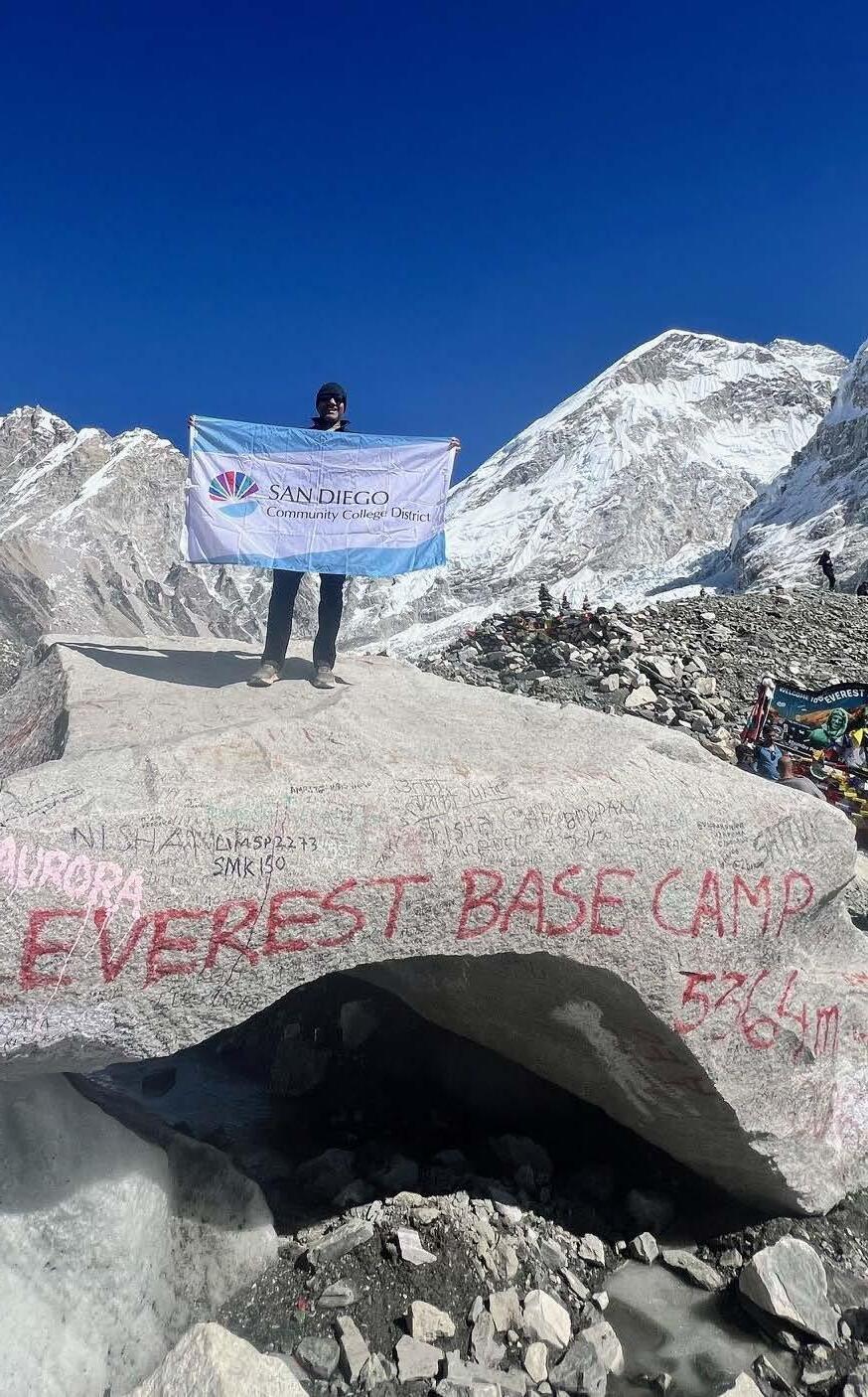 Associate Vice Chancellor Peter Maharaj recently journeyed to the Mount Everest Base Camp at the Khumbu Glacier in Nepal. Upon arrival at the iconic monument perched 17,598 feet above sea level, he hoisted a flag displaying the District’s new logo. He said of this moment: “It was a really proud moment for me. On that particular day it was a really challenging experience because that’s where, due to the oxygen level, I was really feeling it. I felt as though I was holding on to a string just trying to stay upright.”