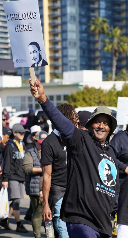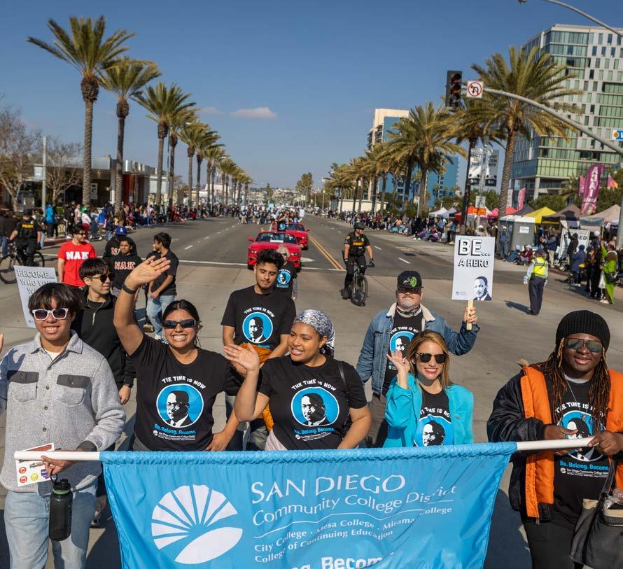 The San Diego Community College District showed off its new cyan blue color during this year’s Martin Luther King Jr. Parade — the first districtwide public event since the District’s new brand was launched in September 2024. Hundreds of students, faculty, classified professionals, College Police, and administrators walked alongside two floats and carried signs that paired the District’s new tagline, “Be. Belong. Become.” with motivational calls to action.