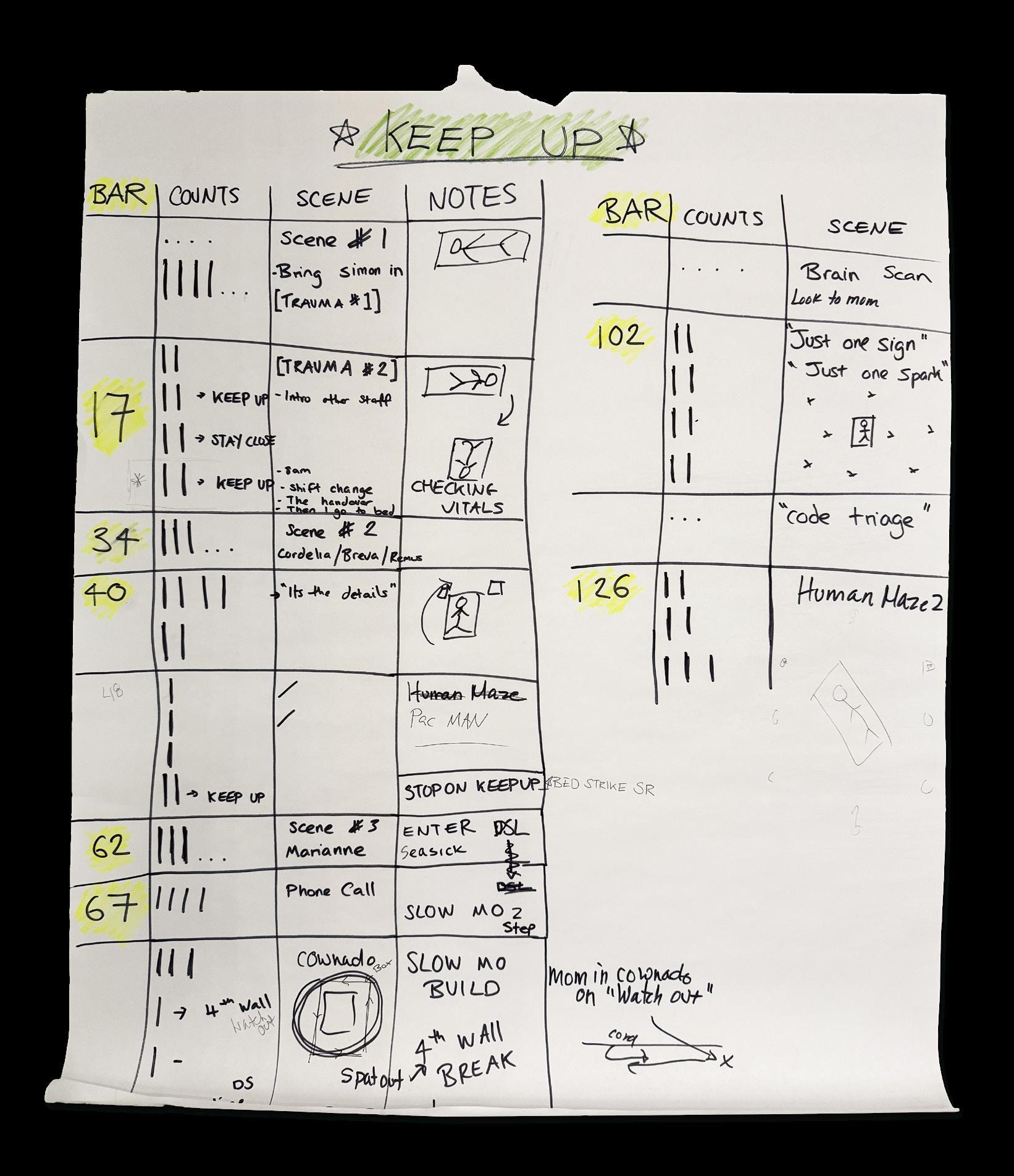 forward. I was not commenting on being a child but rather committing to the action of being. I was a newborn child opening my eyes for the first time and then I was committed to following my impulse to just see the world. When we soften our gaze, our eyes, we can see the world. When I embodied this, I just let my body follow where I was looking, searching—leading me through different dynamic, spatial levels, and expressive colors. By the end of the two-hour rehearsal, the piece was sketched out.