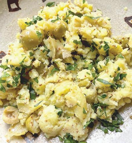 When the potatoes are just tender, tumble them into the bowl with the vinaigrette and smash. Leave various size pieces, don’t get carried away and mash them. Add a dozen green olives cut in half I like Castelvetranos – and a small handful of chopped parsley. Serve warm or at room temperature.