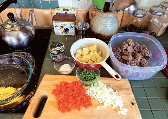 to-build, delicious pie that allows the leftover roast to keep on giving. Or, like I’ve done here, you can skip the roast and just brown a pound of ground beef and half a pound of ground pork to achieve a similar result.