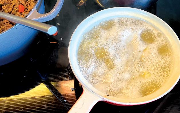 • Peel the potatoes and place in a medium-sized pan, cover with cold water, and bring to a gentle boil. Cook until fork tender.