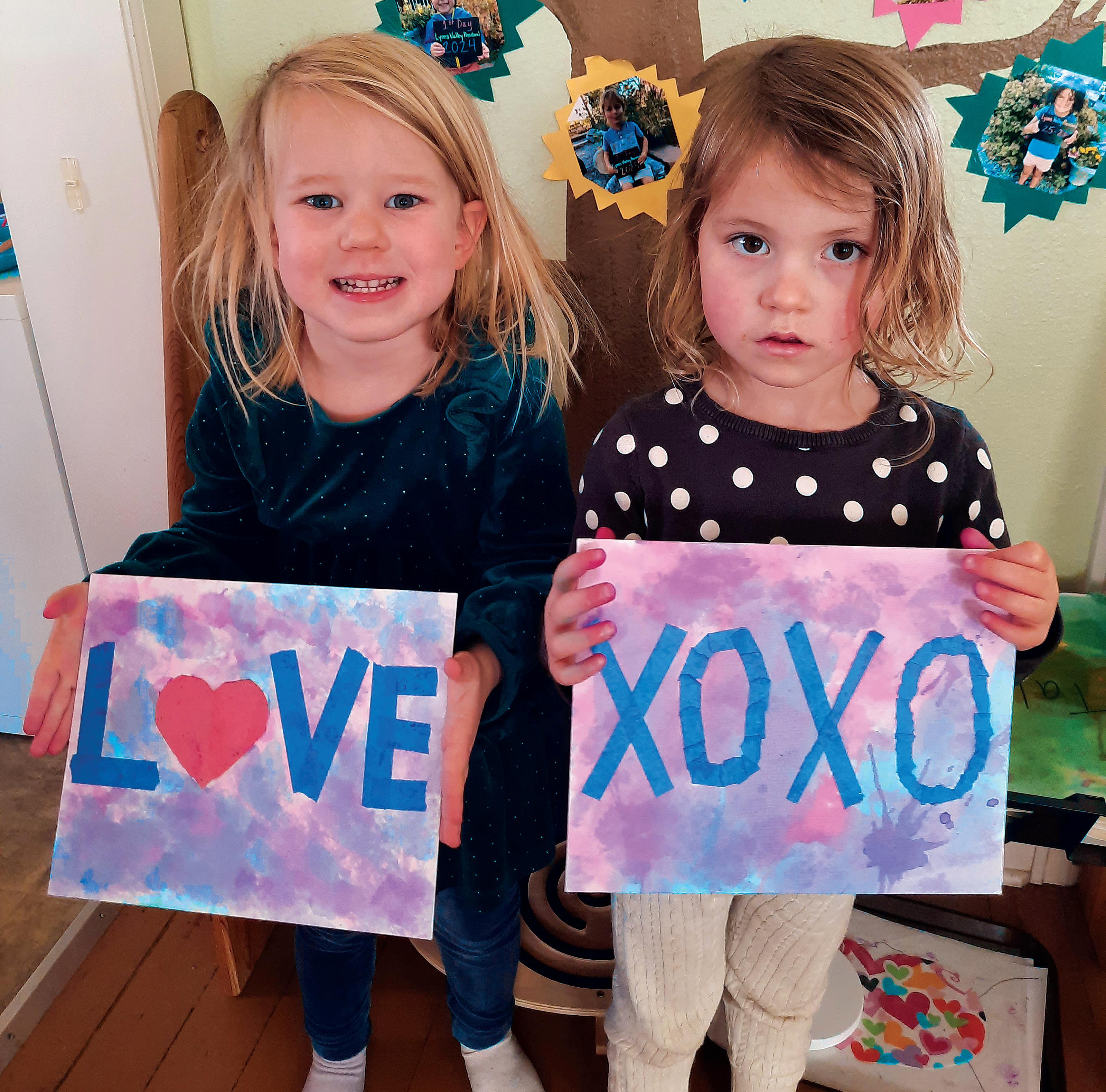 Julia Chiachiere (holding “LOVE”) and Yara North (holding “XOXO”) beam with pride as they show off their Valentine’s creations at Lyons Valley Preschool. Lyons Valley Preschool is a play-based, Montessori-inspired preschool celebrating its twelfth year nurturing young learners in the heart of Lyons. Learn more