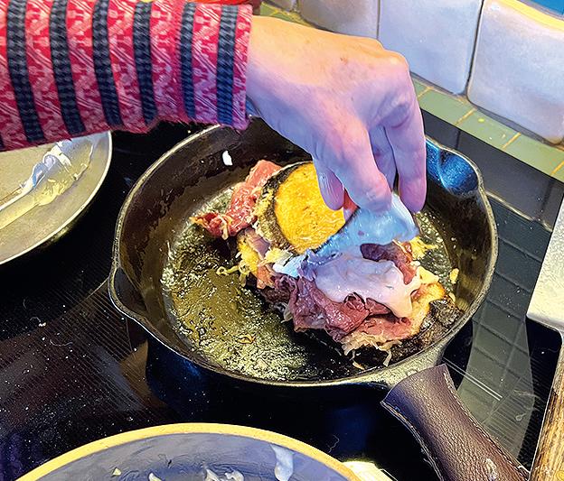 beef. Cover the surface of the corned beef with sauerkraut and a dollop or two of Russian dressing. Replace the bread tops and flip the sandwiches, continuing to cook them until they are golden brow to your satisfaction. Serve hot.