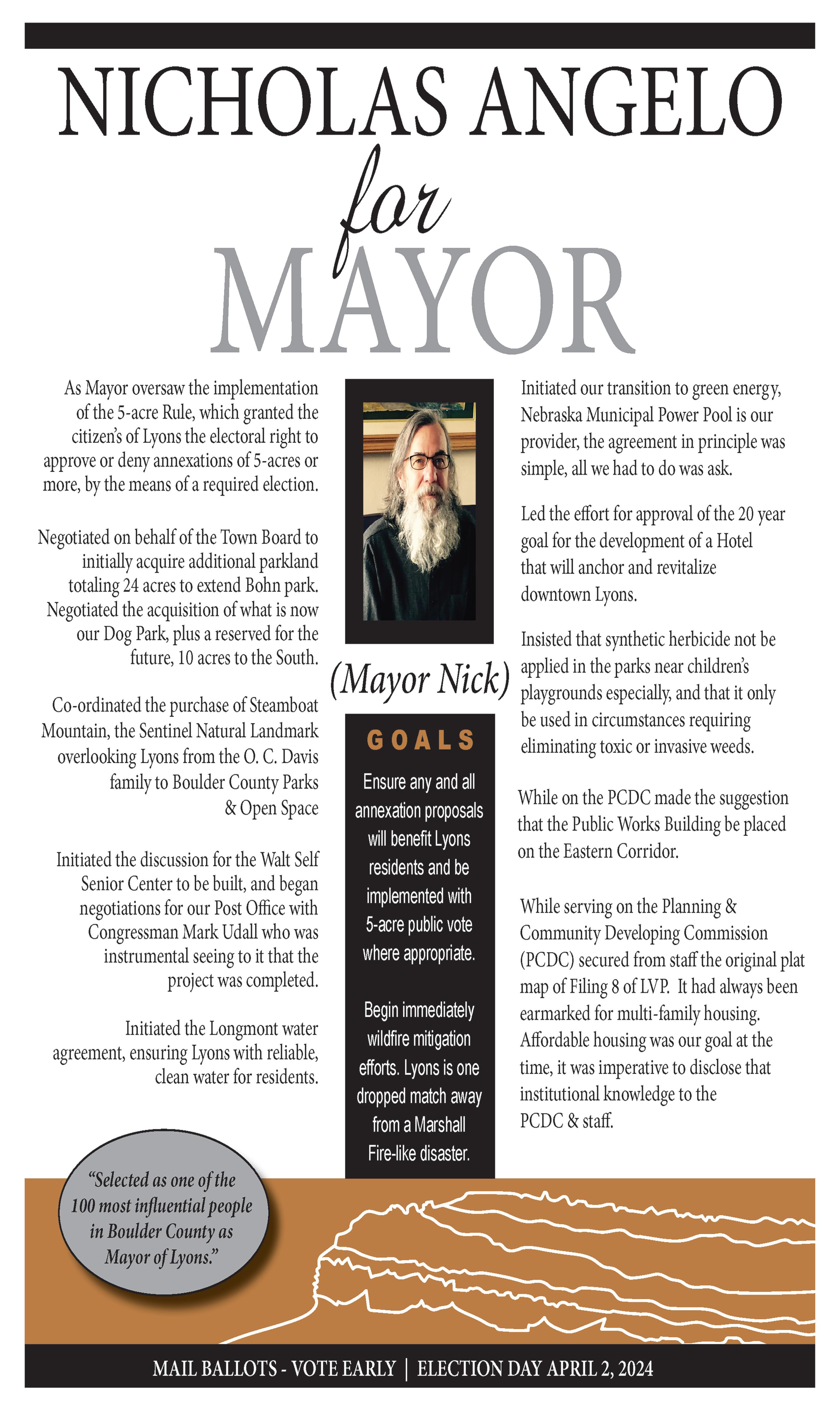 LYONS – The Town recently mailed the required TABOR notification, informing residents that the local Lyons Municipal Election will include a referred ballot measure regarding local sales tax. This notification is required to be sent via mail and is NOT a ballot. Official ballots will be mailed the week of March 11, 2024 to all registered voters who live within the limits of the Town of Lyons. Ballots must be returned and received by the Town before 7 p.m. on Tuesday, April 2, 2024. As a reminder, the Lyons Municipal Election will be a mail ballot only election. Voters may return their completed ballot to the ballot box in front of town hall.