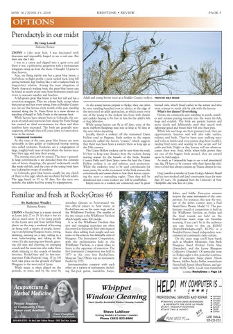 OPTIONS Pterodactyls in our midst By Greg Lowell Redstone Review LYONS – Like most kids, I was fascinated with dinosaurs and impossibly longed to see a real one. But then one day I did. I was in a canoe and slipped into a quiet cove and there it was, a prehistoric apparition with a pterosaurian wingspan rising up from the shore. I thought I’d gone to dino heaven. Alas, my flying reptile was but a great blue heron, a bird whose in-flight profile – neck tucked back, long bill jutting forward, legs trailing like a tail – harkens back its long-extinct relative. Among the most ubiquitous of North America’s wading birds, the great blue heron can be found in nearly every state from freshwater ponds and rivers to seacoast marshes and beaches. A full-grown great blue heron is four feet tall and has a seven-foot wingspan. They are solitary birds, except when they pair up and nest every spring. Here in Boulder County you can see blue herons every month of the year, standing sentinel along the St. Vrain River in a snow shower or impaling a bluegill at Pella Ponds in the summer heat. While herons have always been in Colorado, the creation of ponds and reservoirs here along the Front Range has created an ideal environment for them and their numbers have increased. The birds are generally nonmigratory, although they will come down to lower elevations in the winter. Communal rookeries At this time of the year, great blue herons are most noticeable as they gather at traditional treetop nesting sites called rookeries. Rookeries are a congregation of large, roughly built nests of sticks where the herons incubate their eggs and raise their young. The nesting sites can’t be missed. The trees – generally large cottonwoods – are denuded from the constant rain of heron droppings, the ground underneath smells like week-old fish, and the cries of the young birds have you looking for troops of monkeys. In Colorado, great blue herons usually lay one clutch of three to five eggs, which are incubated by both adults. The eggs hatch in 25 to 30 days. For the next two months, the adults feed the young by regurgitation.