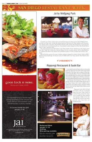 Roppongi Restaurant & Sushi Bar Conveniently located on Prospect Street, it’s obvious why Roppongi is Zagat rated “One of the Top Five Most Popular Restaurants in San Diego” and is a recipient of Wine Spectator’s “Award of Excellence.” Executive Chef Stephen Window continually finesses the extensive menu of tapas, salads, sushi and seafood, delighting guests with fresh, exotic fare prepared with traditional European gourmet cooking techniques. Visit Roppongi during Restaurant Week and try their inventive prix-fixe menu which includes selections such as Pan Roasted Salmon with Curried Cauliflower Puree, Cilantro Pesto and Candied Cashews, and Meyers Natural Flat Iron Steak with Sake Braised Shitake Mushrooms and Chinese Broccoli. Roppongi is open daily for lunch and dinner with an ever-popular happy hour from 3-6pm. Spend an evening dining around the firepit, cozy up around the indoor fireplace and aquarium, indulge at the stunning sushi bar or just have fun watching the scene from their covered/heated patio.