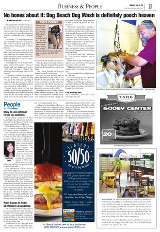 and had to do the honors in her shower. Then, the dogs ran through the house shaking off water. Cleaning the dogs, the house and all the towels, took about four hours. “And I never thought the dogs got cleaned very well,” Donley said. So, with the new business idea in mind, she walked to Dog Beach to run her idea by other pet owners. They loved it and promised to use the shop that would be just a few blocks from the popular beach. “Everyone said they had planned to open one, and we did it.” In less than two years, Donley, a former public relations manager in the health • Dog Beach Dog Wash, field, and her partner, a former nurse, 4933 Voltaire St., (619) 523-1700, were turning a profit. Not a huge one, www.dogwash.com.