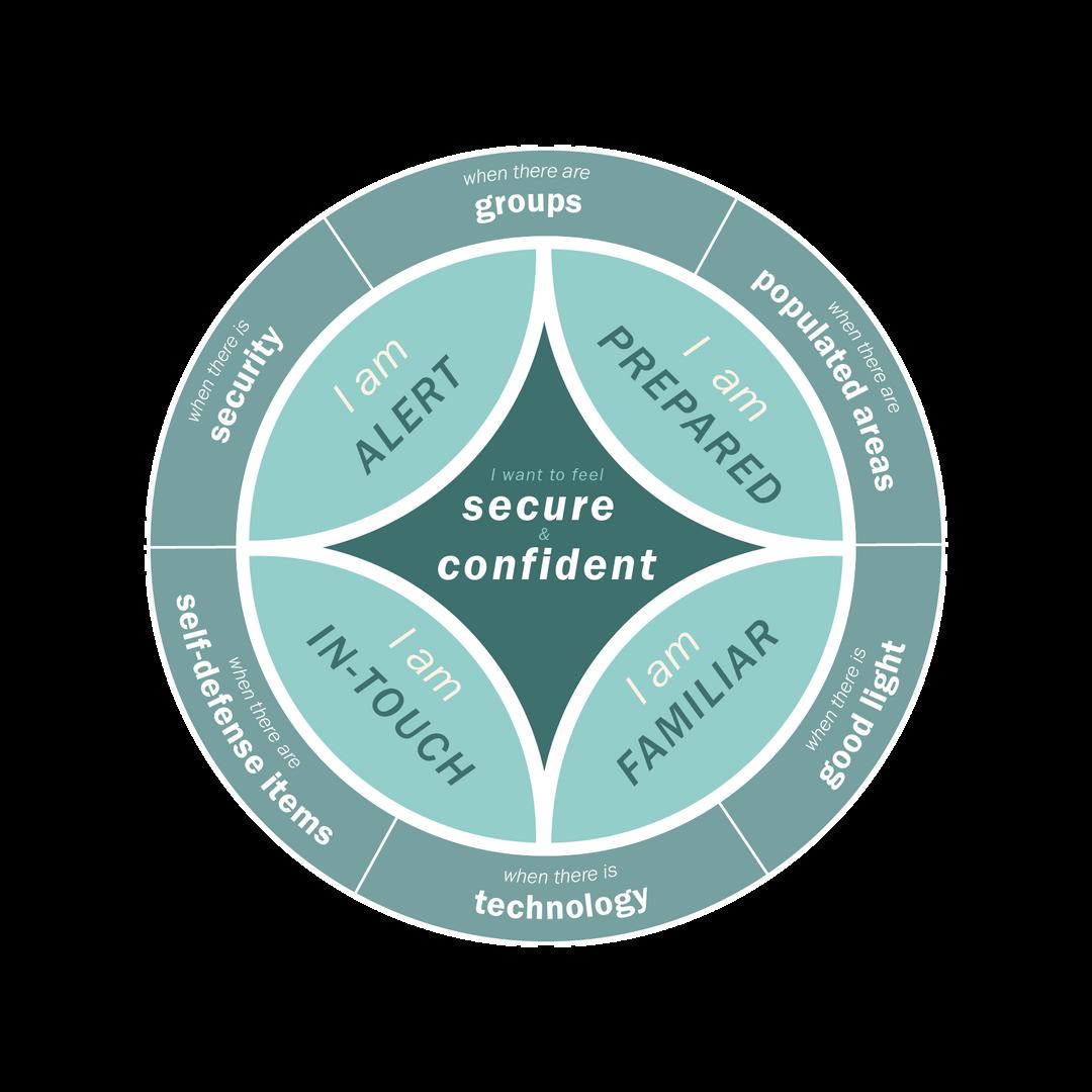 From our collective data, we were able to summarize and communicate the ideal experience of female SCAD students in Savannah The emotions (security & confidence) are how they want to feel when living their dayto-day lives in this city The benefits are the things the women are (in-touch, familiar, alert, & prepared) to ensure they feel secure & confident Then there are the features, whose presence ensure the delivery of the benefits.