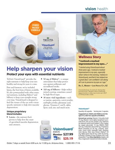 “I noticed a marked improvement in my eyes…” “I started using VisionGuard about three years ago. I noticed a marked improvement in my eyes, especially when I drive in the evening. I believe in VisionGuard, and feel it has helped me a great deal. I am confident I am doing all I can to preserve my eyes as I age.” Bill S., Member—Lake Havasu City, AZ General disclosure: In return for sharing their personal stories, Members whose testimonials appear in print or online may receive up to $125 in TriVita product credits.