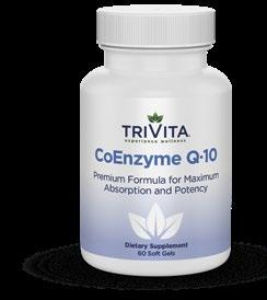 CoEnzyme Q-10 (CoQ-10) is an important “bioenergetic antioxidant” that’s concentrated in the heart. The natural aging process may deplete CoQ-10, potentially leading to low CoQ-10 status. Statin drugs may also deplete CoQ-10. This “CoQ-10 drain” may affect your heart: Low CoQ-10 has been linked to diminished cardiac energy and cardiovascular health concerns.1-4 TriVita CoQ-10 may address these heart health concerns because it helps to replenish what statin drugs and aging may have taken away.5 By correcting your CoQ-10 status, you may promote this unique nutrient’s diverse range of cardio-supportive biological activities: • CoQ-10 is necessary in adequate amounts for heart energy metabolism6 • CoQ-10 is a cardiovascular antioxidant that helps protect the heart and blood vessels7 • CoQ-10 supports the function of the blood vessel linings, potentially helping with circulation8 • CoQ-10 may help maintain heartbeat stability and the heart’s bloodpumping efficiency9 • CoQ-10 may help to maintain blood pressure that’s already within normal range10 Supplying 50 mg of quality CoQ-10 in each easy-to-swallow soft gel, TriVita CoQ-10 is a convenient way to help contribute to the CoQ-10 status that’s associated with healthy cardiovascular function.