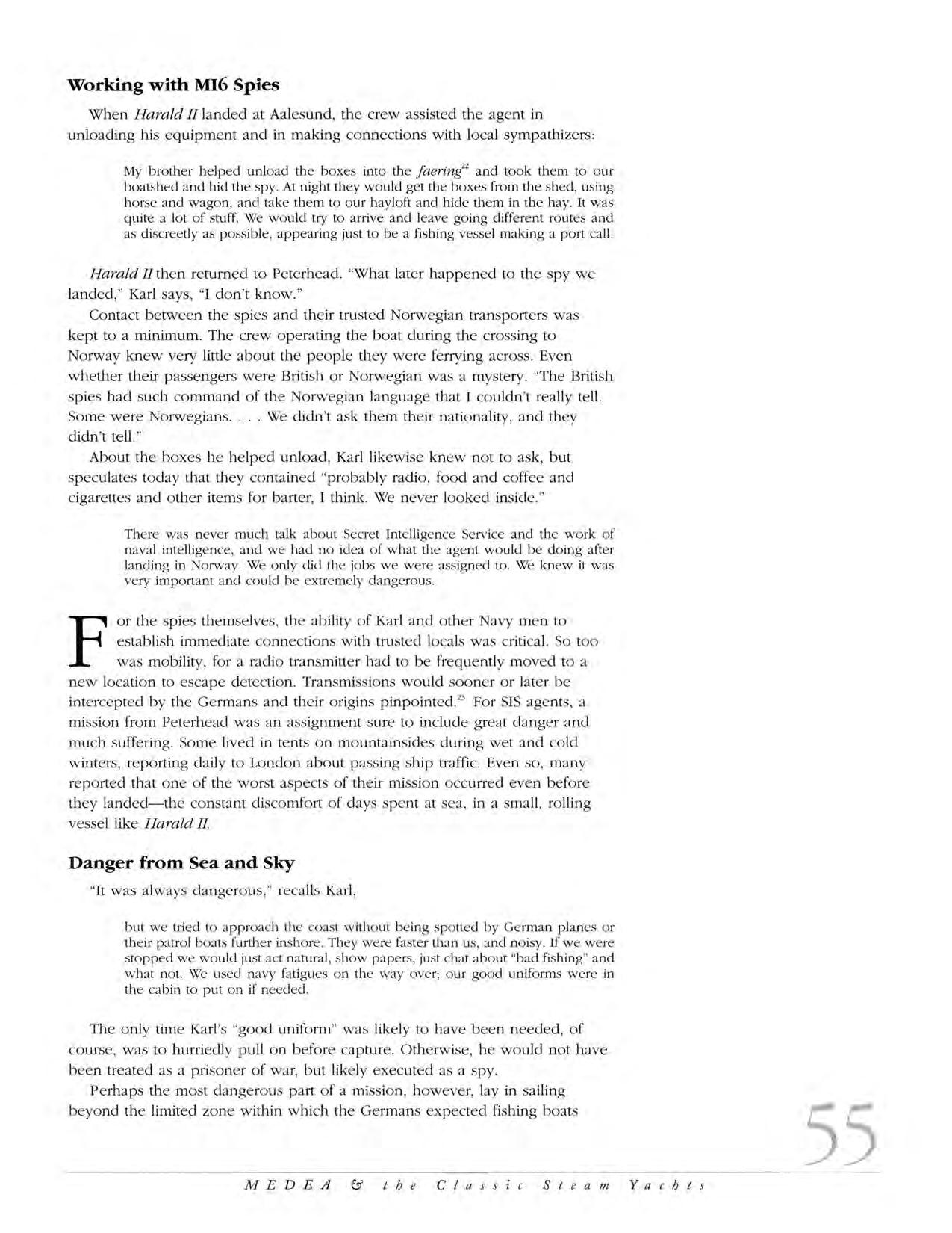 Co nt act between the spi es a nd their trusted Norwegian transporters was kept to a minimum. The crew ope rat in g the boat during the crossing to Norway knew very little about the people they were ferrying across Even whether their passengers were British or Norweg ian was a mystery. "The British spies had su ch comma nd of the Norwegia n language tha t I cou ldn 't really tell. Some were Norwegia n s .... We didn 't ask them their nationa lity, and they didn 't tell. "
