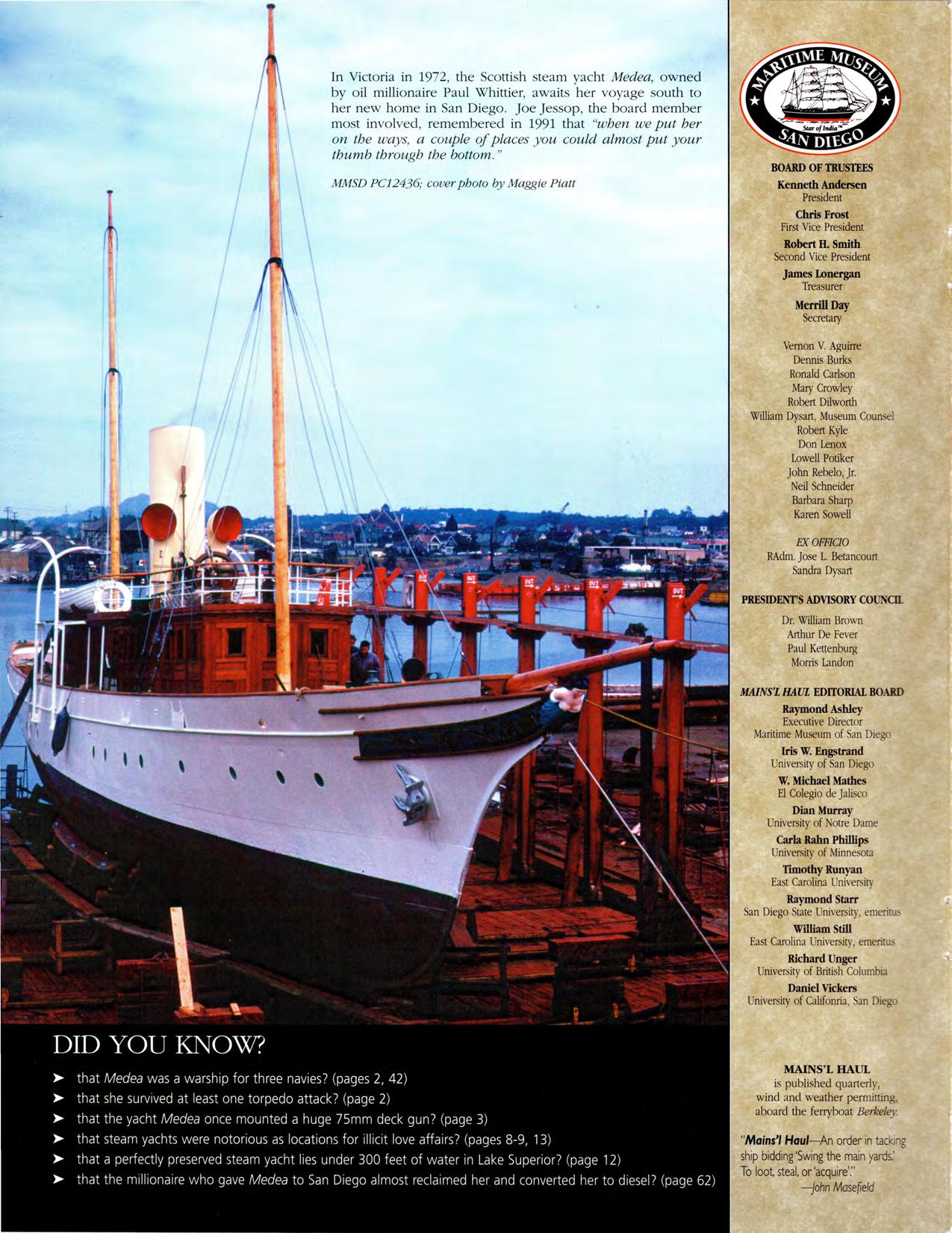 Subscribeto Mains'/ Haul by joining the Maritime Museum of San Diego! Members alsoreceivea quarterlynewsletterand other benefits.Tosubscribe, comment,or submitarticlesto this peer-reviewedquarterly,visitthe Mains'/Haulpagesat www.sdmaritime.org,emaileditor@sdmaritime.org, or writeto Mains'/Haul,MaritimeMuseumof SanDiego,1492N. HarborDr,SanDiego,CA 9210I