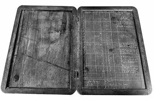 Navigation slate from the Euterpe written in white chalk within etched columns, set in a wooden frame with a hinged door. The position indicated is 77 degrees east, 44 degrees south, in the Southern Ocean. The adjacent logbook is original to Euterpe and contains daily observations of sea conditions, wind, distance travelled, latitude and longitude for the 1885 voyage.