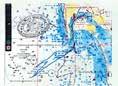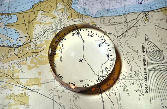 bearing lines called loxodromes, emanating from several compass roses. Once the use of parallel rule came into common practice in the eighteenth century, it became more practical to “walk” the course and bearing lines from the compass roses. Charts became graphically cleaner and simpler.