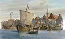Much of the time creating these paintings was spent researching the histories and specifications of the ships. We have only vague ideas of the earliest vessels; there are no known documents or detailed descriptions of them. Not until well into the seventeenth century were ships being built from plans. To accurately portray any vessel, I begin by studying their plans, have often created my own when none existed, and occasionally build small models to help visualize them.