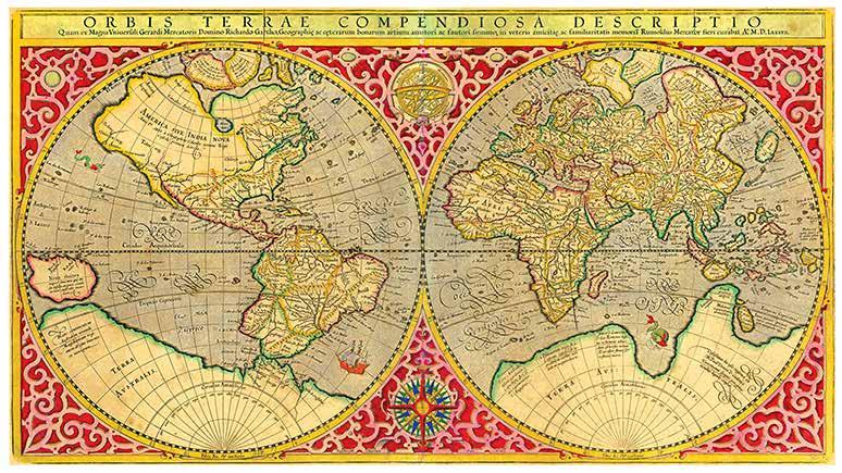This world map by the Flemish cartographer Gerard Mercator was based on the writings of the ancient geographer Claudius Ptolemy. The engraved decorative border includes a frieze of allegorical figures representing the four elements: Fire (Zeus), Air (Hera), Water (Poseidon), and Earth (Gaia). While Mercator is perhaps best known for his modern maps and the map projection which bears his name, one of his life goals was to produce his own version of Ptolemy’s Geographia . As a second installment of his Atlas sive Cosmographia , Mercator published an authentic version of Ptolemy, deliberately devoid of the distracting interpretations and