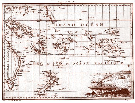map includes a decorative cartouche with depictions of Polynesian sailing vessels, further reflecting the contemporary European fascination with the cultures and societies of the peoples of Oceania.