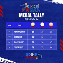 In the Elementary Division, East Unit led the medal tally with 51 gold, 53 silver, and 44 bronze medals The South Unit finished as 1st Runner-up with 50 gold, 35 silver, and 44 bronze medals, the North Unit placed third with 31 gold, 36 silver, and 45 bronze medals, and the Central Unit finished fourth with 30 gold, 38 silver, and 36 bronze medals