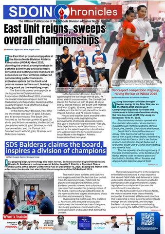 he East Unit proved unstoppable at the Ilocos Norte Division Athletic Association (INDAA) Meet 2025, claiming the overall championships in both the Elementary and Secondary divisions and setting a new standard of excellence as their athletes delivered commanding performances in explosive sprints on the track and precise moves on the court, leaving a lasting mark on the weeklong meet.