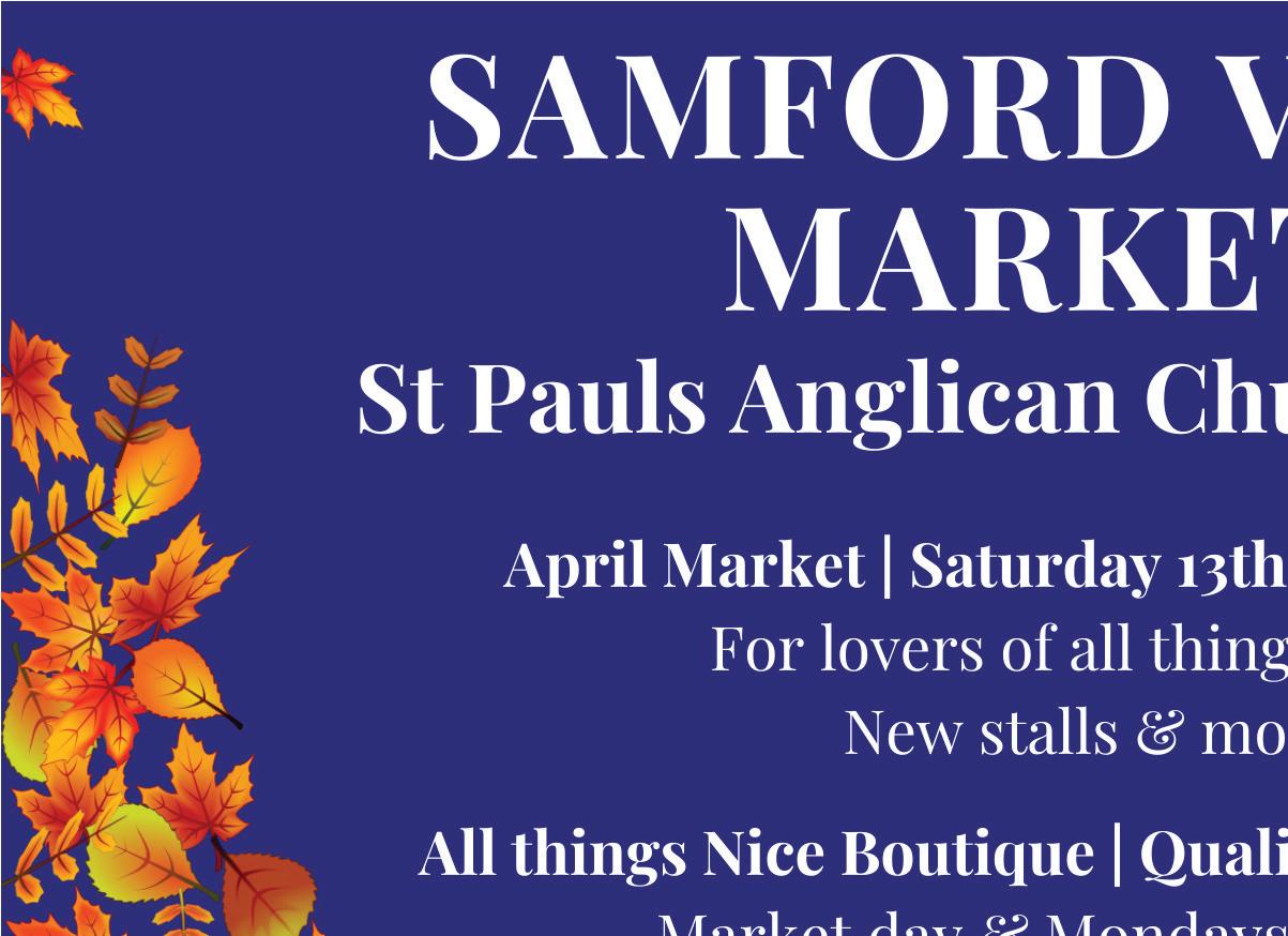 Samford Valley Markets. 2nd Saturday each month 7am-noon. Facebook: Samford Valley Markets.