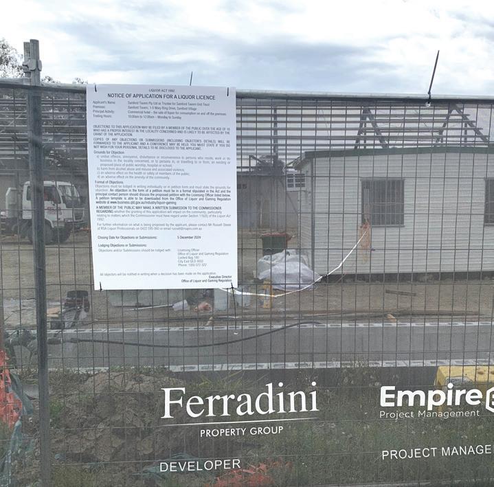 A public notice for the application of a liquor licence has been displayed on the fence line at the development site, with written objections closing 5 December 2024.