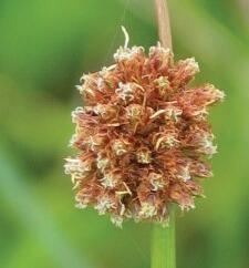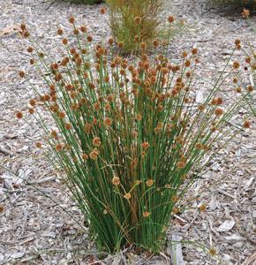 The knobbly club rush is a fast growing sedge, reaching a height of 1 metre and width of half a metre. It has fine, bright green rushlike foliage (used by Maori people to thatch the roofs of their houses and by other indigenous people in basket weaving) and insignificant white flowers in summer, followed by attractive, globular brown seed heads.