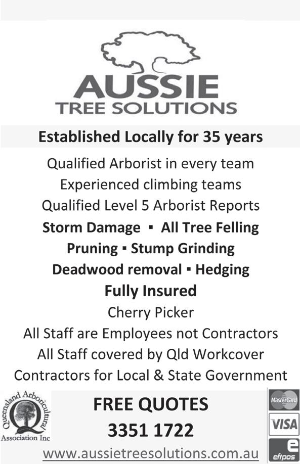 Page 52 - THE VILLAGE PUMP 15 SEPTEMBER 2023 CLASSIFIEDS – editor@villagepump.org.au • Tree Removals & Tree Pruning • Qualified Arborist Consultations & Tree Risk Assessments • Insurance / Storm Work • Stump Grinding & Poisoning • Landscaping • Land Clearing • Aged Forest Mulch –Supplied & Spread • Seasoned Firewood Call us on 3289 3610 for a quote northbrisbanetrees.com.au PO BOX 619, SAMFORD Q. 4520 Local Samford Arborists Landscaping Supplies Open & Delivering 7 Days
