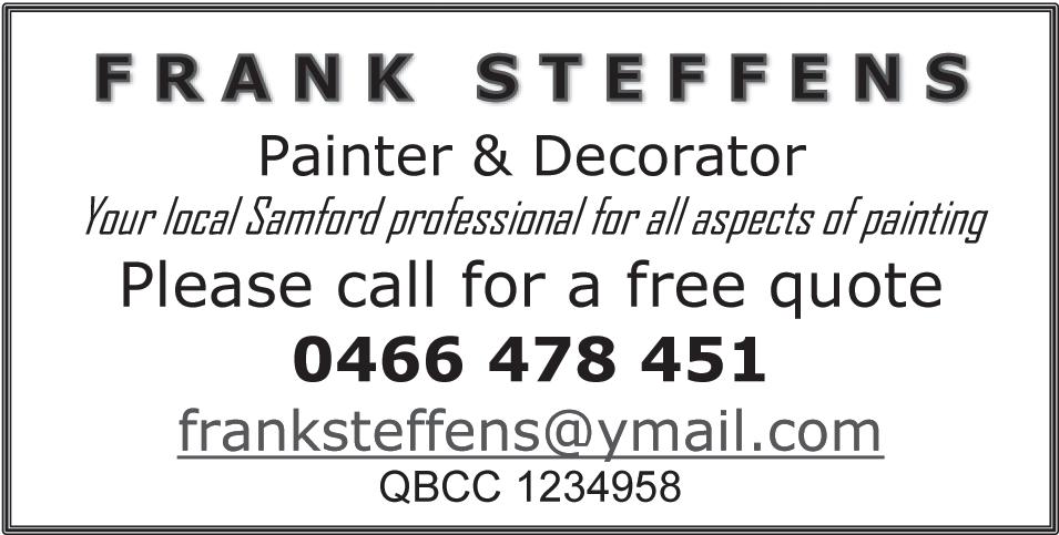 Men’s Coffee Morning: Meet other local retired and semi-retired men for a coffee and chat. 9.30am every Friday at Fish Lips, Main St, Samford. Contact Morris: 0409 614 85 Millen Farm a not-for-profit volunteer run organic permaculture-based community farm - education area, market garden, community exchange. Contact: Martine Nordh 0450 696 854.