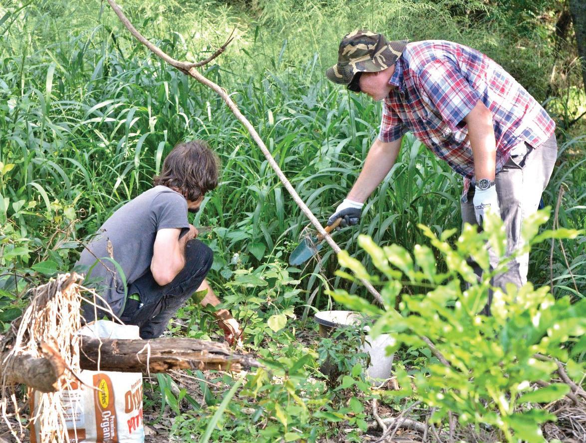 Pictured left: Volunteers tackling the weeds on the edge of rainforest zone P4.