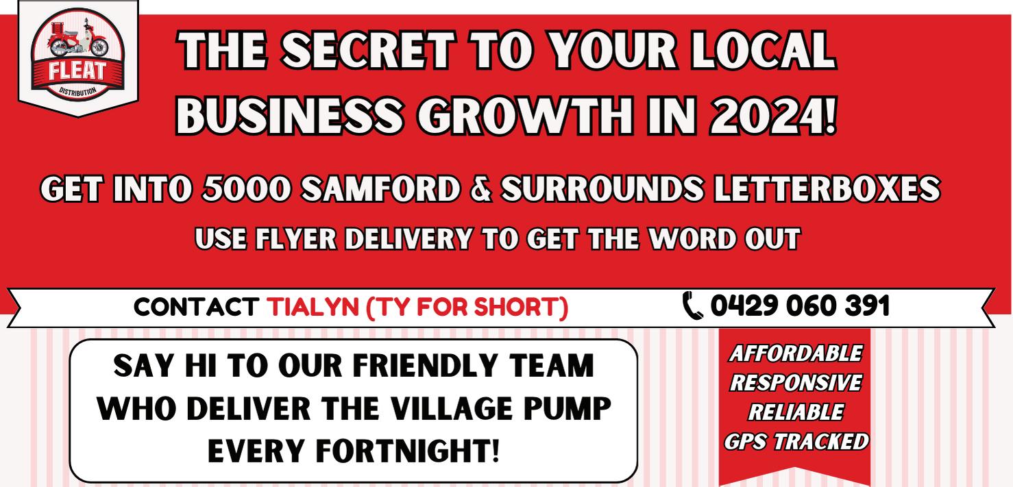 The Village Pump is owned and operated by Samford Progress (SDPPA) Serving the Samford and surrounding community since 1970. DID YOU KNOW... When you advertise in The Village Pump, you are also supporting the local community! FIND OUT HOW editor@villagepump.org.au