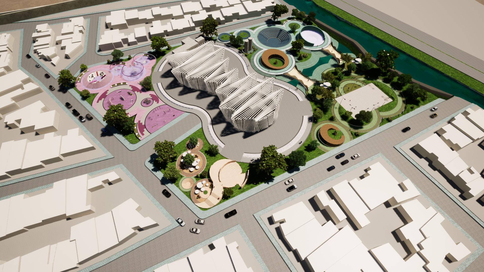 Apart from the cultural center, the project also includes an intervention to the boulevard, improving the green area to concrete ratio to achieve a better temperature in the area and give a better look. Throughout the boulevard there are hyperbolic paraboloids that serve as covered areas of interaction and protect monuments and statues that would be placed.